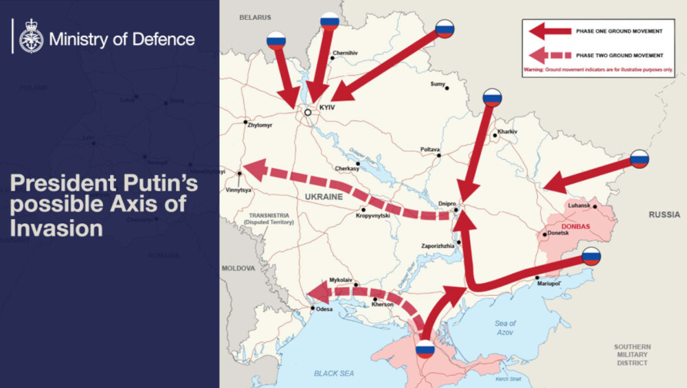 Όπως φαίνεται στο χάρτη, παρουσιάζεται πιθανή η εισβολή στην Ουκρανία όχι μόνο στην περιοχή του Ντονμπάς, αλλά και στην υπόλοιπη χώρα. Σύμφωνα με το χάρτη του βρετανικού Υπουργείου Άμυνας, δεν αποκλείεται η πιθανότητα εισβολής από τη Λευκορωσία και η κατάληψη του Κιέβου.