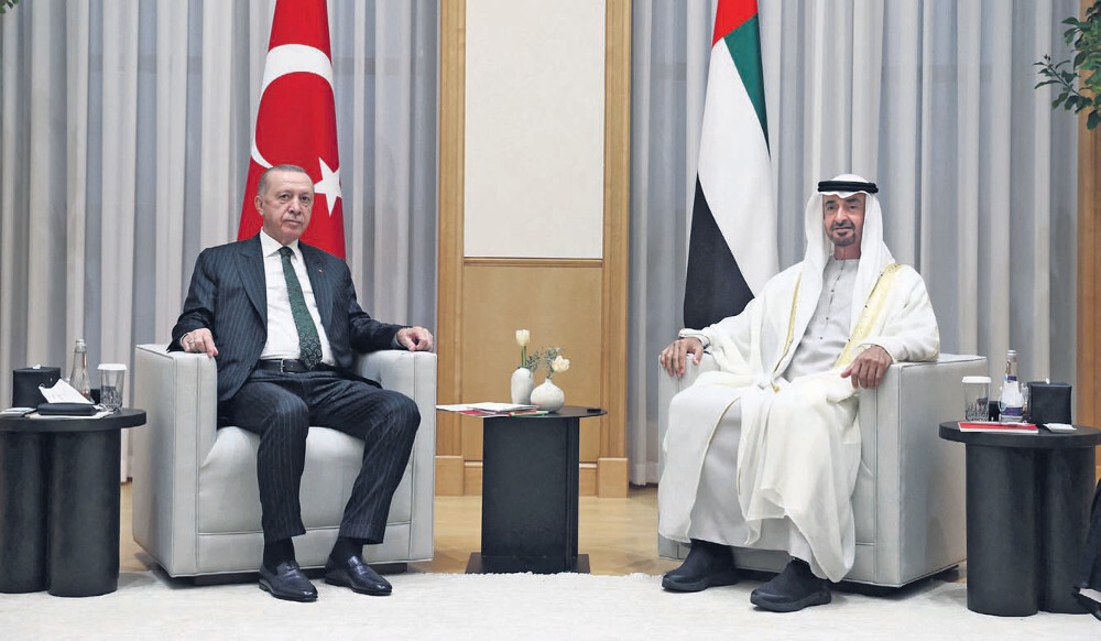 Τα πράγματα άλλαξαν στα μέσα του περασμένου φθινοπώρου, με την επίσκεψη του ντε φάκτο ηγέτη των ΗΑΕ Μοχάμεντ μπιν Ζαγιέντ αλ Ναχιάν στην Τουρκία και την υπογραφή πολλών συμφωνιών, ως και την προώθηση ισχυρότατων επενδυτικών «ενέσεων» στους τομείς του εμπορίου, του τουρισμού, των κατασκευών, της τεχνολογίας, της γεωργίας, της άμυνας στη δοκιμαζόμενη τουρκική οικονομία (νομισματική κρίση, υψηλός πληθωρισμός κ.ά.).
