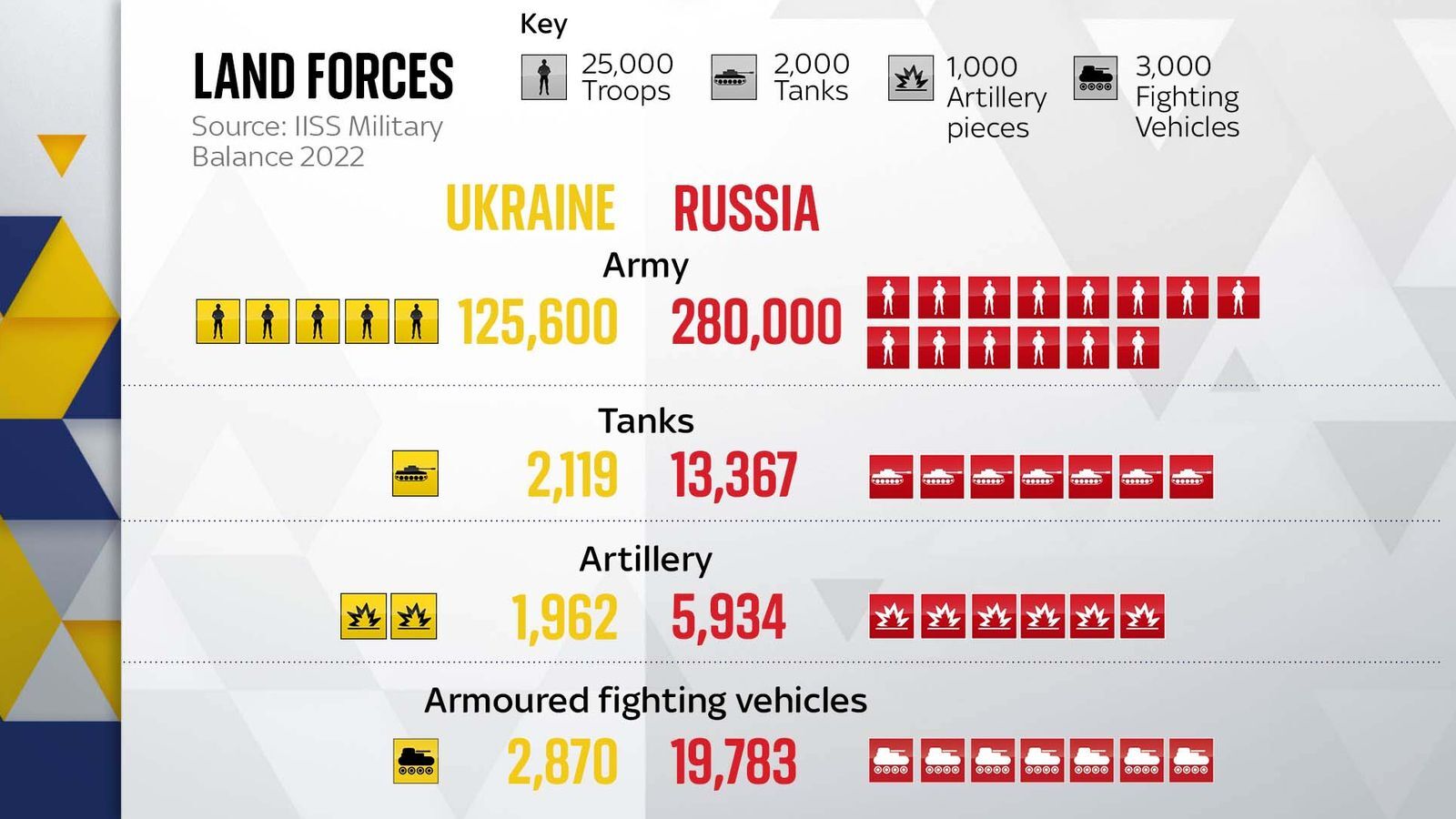 Η Ρωσία διαθέτει 280.000 στρατιώτες έναν 123.000 της Ουκρανίας. Όσον αφορά τα τεθωρακισμένα οχήματα ( τανκς, πυροβολικό και οχήματα μεταφοράς προσωπικού η Ρωσία επικρατεί κατά κράτος.