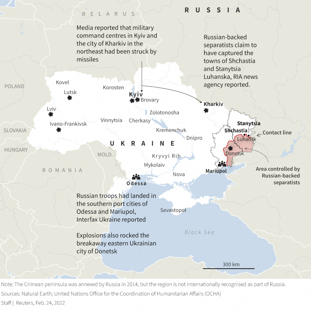 Από τρία διαφορετικά σημεία φαίνεται πως εισέβαλαν στην Ουκρανία οι ρωσικές δυνάμεις. Σύμφωνα με ανακοίνωση της συνοριοφρουράς της Ουκρανίας, τα ρωσικά στρατιωτικά κονβόι πέρασαν τα ουκρανικά σύνορα — κυρίως από τη χερσόνησο της Κριμαίας την οποία προσάρτησε το 2014 η Ρωσία– και εισήλθαν στο Τσερνίχιβ, το Χάρκοβο και το Λουχάνσκ. «Ρωσικά στρατιωτικά οχήματα, περιλαμβανομένων τεθωρακισμένων, παραβίασαν τα σύνορα στις περιοχές Τσερνιχίβ (στον βορρά, στη μεθόριο με τη Λευκορωσία), στο Σούμι (βορειοανατολικά), το Λουχάνσκ και το Χάρκοβο (ανατολικά)» από το σημείο περάσματος μεταξύ της χερσονήσου (της Κριμαίας) και της ηπειρωτικής Ουκρανίας, εξήγησε η συνοριοφρουρά, δημοσιεύοντας ένα βίντεο στο οποίο φαίνονται οχήματα τα οποία έχουν πάνω τους το γράμμα «Ζ».
