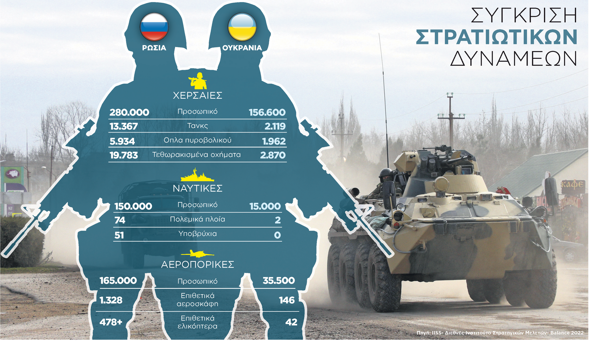 Στην ξηρά τα πράγματα δείχνουν πιο ισορροπημένα από ποσοτική άποψη, καθώς η Ουκρανία αντιπαραβάλλει 125.600 στρατιώτες απέναντι στους 280.000 Ρώσους.