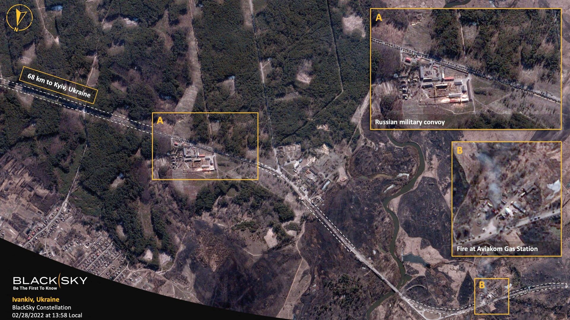 Στις εικόνες βλέπει κανείς εκατοντάδες οχήματα, το ένα πίσω από το άλλο, σε δρόμους της ουκρανικής επαρχίας και, ενίοτε, καπνό σε μικρή απόσταση, που προέρχεται από φλεγόμενα κτίρια, κατά την εταιρεία.