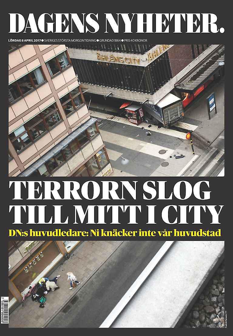 «Ο τρόμος έπληξε την καρδιά της πόλης», είναι ο τίτλος σήμερα της εφημερίδας Dagens Nyheter, η οποία δημοσιεύει τη φωτογραφία του φορτηγού που κατέληξε πάνω στη βιτρίνα μεγάλου καταστήματος, μετά τη φονική του πορεία. Κατά τη διάρκεια της νύχτας, η αστυνομία απομάκρυνε το φορτηγό από το σημείο της τραγωδίας.