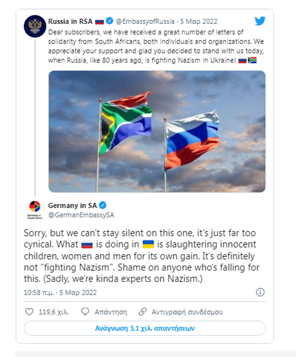 Η ρωσική πρεσβεία στη Ν.Αφρική σε ανάρτησή της στο Twitter αναφέρει : «Πολεμάμε τον Ναζισμό στην Ουκρανία» και από κάτω η γερμανική πρεσβεία απαντά λέγοντας: «Ντροπή σε όσους σας πιστεύουν, είμαστε εξπέρ στον Ναζισμό κ εσείς δεν πολεμάτε Ναζί».