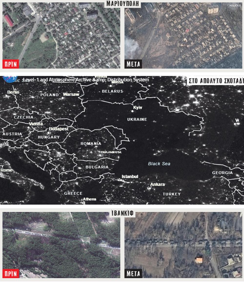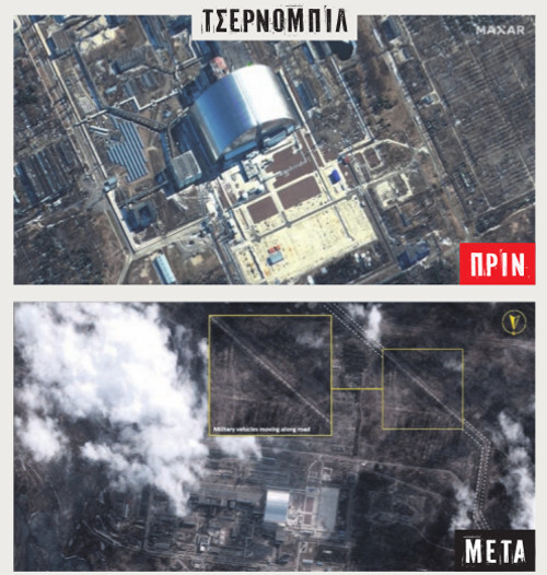 Τα στιγμιότυπα από τους δορυφόρους κατέγραψαν και τις ώρες μετά την κατάληψη των εγκαταστάσεων του πυρηνικού αντιδραστήρα του Τσέρνομπιλ από τους Ρώσους. Στη φωτογραφία ξεχωρίζουν η σαρκοφάγος, μια στήλη καπνού σε κοντινή απόσταση και ρωσικά τανκ να περνούν από τον περιφερειακό δρόμο. Βίντεο που ανάρτησε Ουκρανός δημοσιογράφος από τη Βολνοβάκχα στο Ντονμπάς δείχνει την απόλυτη καταστροφή, καθώς ολόκληρα οικοδομικά συγκροτήματα έχουν γίνει συντρίμμια.
