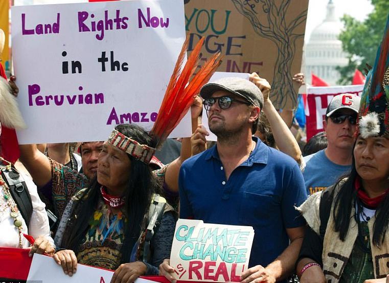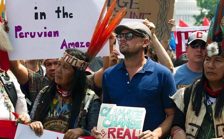 Ο διάσημος ηθοποιός Λεονάρντο ΝτιΚάπριο συμμετείχε στην πορεία και ήταν στη μέση μιας ομάδας ιθαγενών Αμερικανών. «Η κλιματική αλλαγή είναι πραγματική», έγραφε το πλακάτ που κρατούσε.