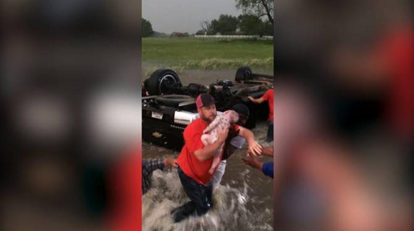Στις εκκλήσεις του Μίτσελ ανταποκρίθηκαν αρκετοί άνθρωποι που δεν δίστασαν ούτε λεπτό να μπουν μέσα στα ορμητικά νερά για να βγάλουν από το όχημα τους τρεις εγκλωβισμένους.