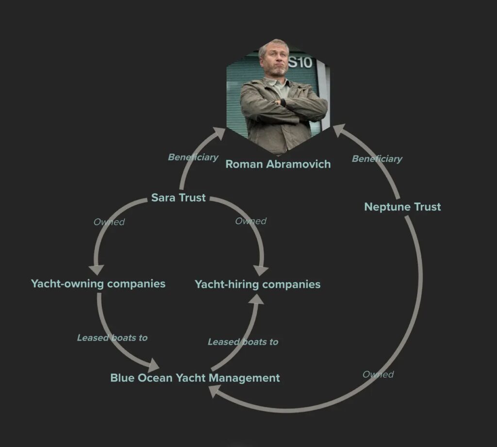 Τα έγγραφα δείχνουν ότι αυτά τα σούπερ γιοτ ανήκαν το καθένα σε ξεχωριστές εταιρείες εγγεγραμμένες στις Βρετανικές Παρθένες Νήσους (BVI), οι οποίες με τη σειρά τους ανήκαν σε ένα μοναδικό trust. Και το trust τελικά ανήκε στον Αμπράμοβιτς.