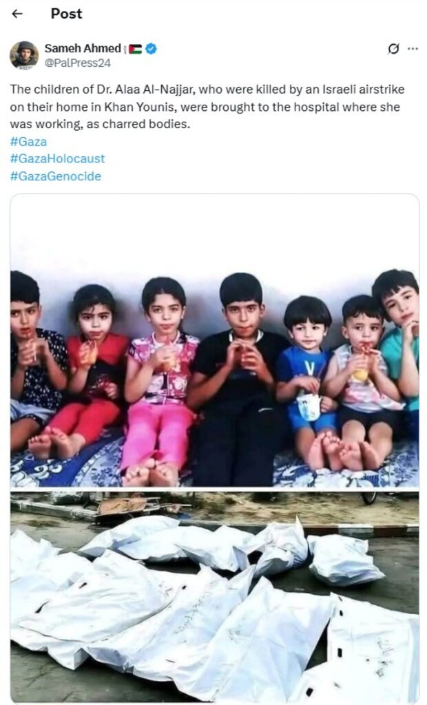 Η δραματική ειρωνεία είναι ότι η δρ Al-Najjar αναγκάστηκε να αναγνωρίσει τα πτώματα των παιδιών της στο νοσοκομείο όπου εργάζεται, βιώνοντας την οδύνη της απώλειας της οικογένειάς της. Αυτή η τραγική κατάσταση αποτελεί μια εσκεμμένη πράξη απύθμενης βαρβαρότητας κατά των παιδιών, των παλαιστινιακών οικογενειών και της ανθρωπότητας συνολικά. Οι λέξεις δεν αρκούν για να περιγράψουν το μέγεθος αυτής της φρίκης…