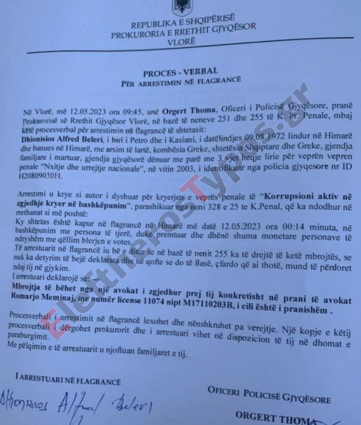 Είχε προηγηθεί στις 08.05.2023, από την Εισαγγελία Πρωτοδικών Αυλώνα η ποινική δίωξη με αρ. 489, με βάση την παραπομπή που έγινε από την Τοπική Αστυνομική Διεύθυνση Αυλώνα, για το ποινικό αδίκημα «Ενεργητική διαφθορά στις εκλογές».