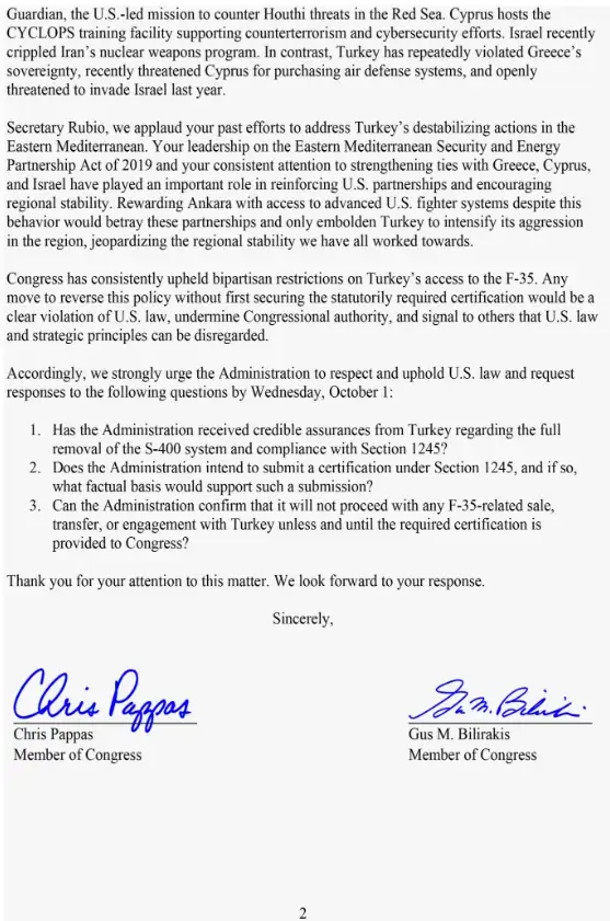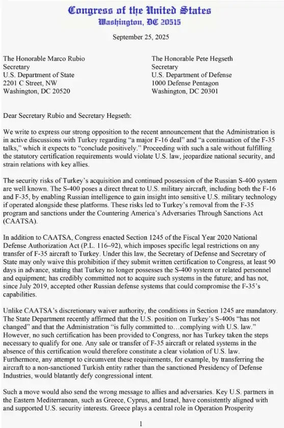 Οι βουλευτές επισημαίνουν ότι η πώληση αεροσκαφών F-16 και F-35 στην Τουρκία χωρίς την απαιτούμενη πιστοποίηση από το Κογκρέσο θα ήταν σαφής παραβίαση της αμερικανικής νομοθεσίας και θα υπονόμευε την εξουσία του Κογκρέσου.
