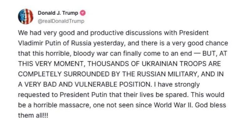 «Είχαμε πολύ καλές και παραγωγικές συνομιλίες χθες με τον πρόεδρο Βλαντιμίρ Πούτιν και υπάρχει μια καλή πιθανότητα αυτός ο φρικτός και αιματηρός πόλεμος να τελειώσει τελικά – αλλά, αυτή τη στιγμή, χιλιάδες ουκρανικά στρατεύματα είναι εντελώς περικυκλωμένα από τον ρωσικό στρατό και σε δύσκολη και ευάλωτη θέση. Απευθύνω σθεναρή έκκληση στον πρόεδρο Πούτιν να σώσει τις ζωές χιλιάδων Ουκρανών», έγραψε σε ανάρτησή του στο κοινωνικό δίκτυο Truth Social. Επιπλέον, προσθέτει ο Τραμπ, αν αυτό δεν συμβεί, θα είναι «μια φρικτή σφαγή, που όμοιά της δεν έχουμε δει από τον Β’ Παγκόσμιο Πόλεμο».