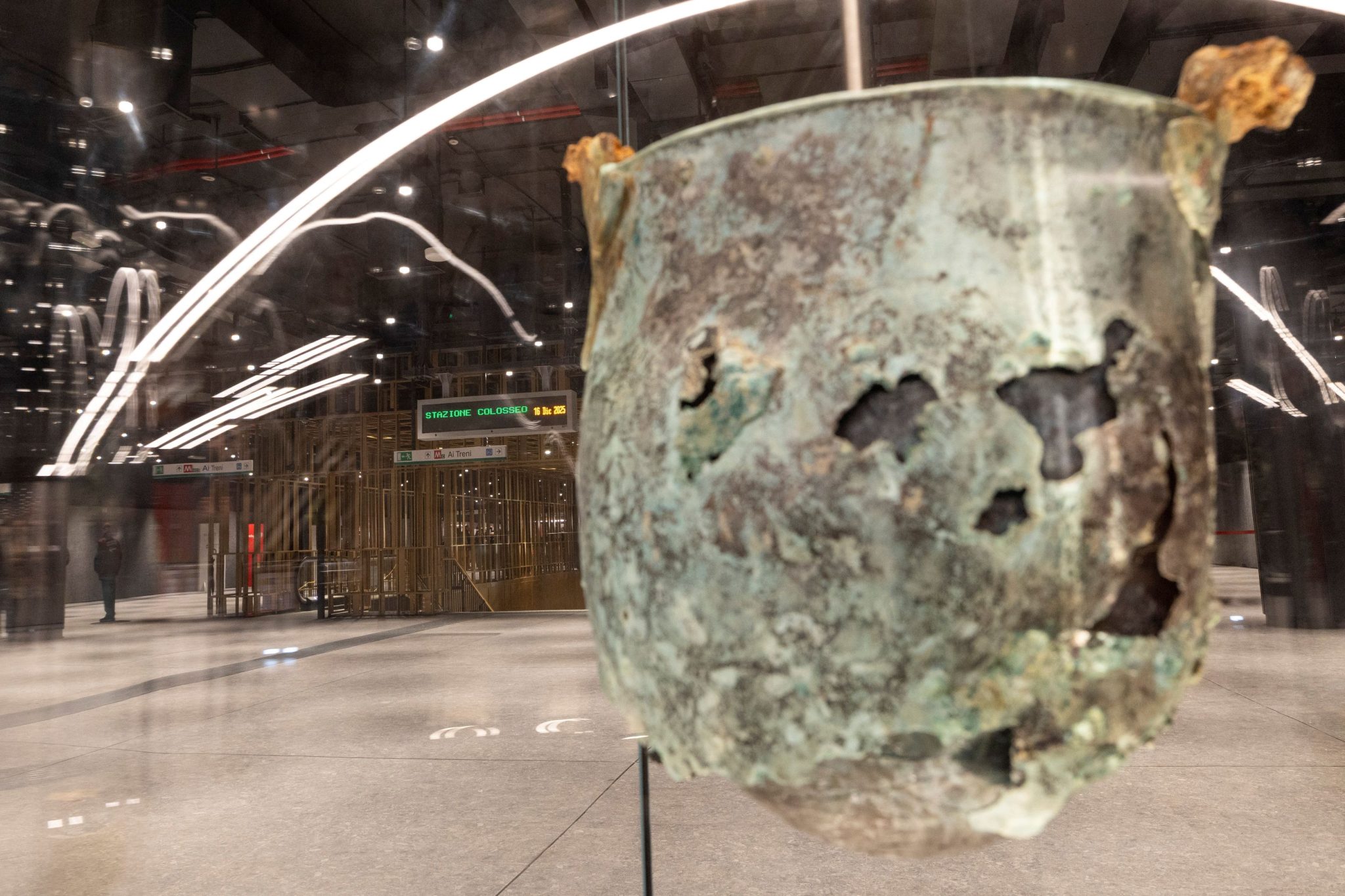 Στον σταθμό δίπλα στο εμβληματικό αμφιθέατρο εκτίθενται κεραμικά αγγεία και πιάτα, καθώς και τα ορατά τμήματα ενός λουτρού που ανήκε σε κατοικία του 1ου αιώνα. Τα εκθέματα είναι τοποθετημένα πίσω από προστατευτικά υαλοπετάσματα και συνοδεύονται από ενημερωτικές επιγραφές και οθόνες που προβάλλουν τη διαδικασία των ανασκαφών, τα ημερολόγια εργασίας και τη μεθοδολογία τεκμηρίωσης.