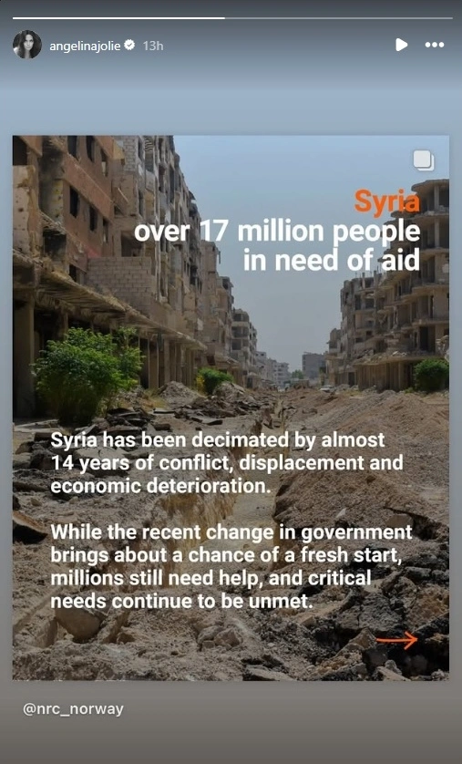 «Συρία: Πάνω από 17 εκατομμύρια άνθρωποι χρειάζονται βοήθεια», υπογράμμισε σε insta story η Τζολί και πρόσθεσε. «Η Συρία έχει αποδεκατιστεί από σχεδόν 14 χρόνια συγκρούσεων, εκτοπισμού και οικονομικής επιδείνωσης. Ενώ η πρόσφατη αλλαγή στην κυβέρνηση φέρνει μια ευκαιρία για μια νέα αρχή, εκατομμύρια άνθρωποι εξακολουθούν να χρειάζονται βοήθεια και οι βασικές ανάγκες να μην καλύπτονται».