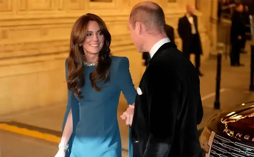 Το ζευγάρι ήταν ευδιάθετο και έδωσε στους φωτογράφους ένα σπάνιο στιγμιότυπο, αφού κρατούσε ο ένας το χέρι του άλλου, καθώς έφταναν στην διάσημη λονδρέζικη σκηνή. Η πριγκίπισσα Κέιτ ήταν εντυπωσιακή και φάνηκε να αποτίει φόρο τιμής στη σουηδική σημαία με ένα γαλαζοπράσινο φόρεμα από τον βρετανικό οίκο Safiyaa, με ιδιαίτερα μανίκια. Το συνδύασε με ένα εκθαμβωτικό βραχιόλι από διαμάντια ενώ κρατούσε ένα clutch Jenny Packham, σύμφωνα με την Daily Mail.