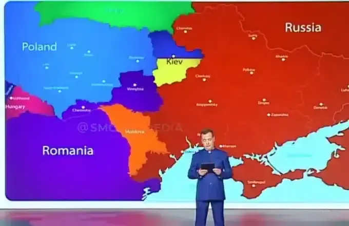 Σε δημόσια διάλεξή του ο Μεντβέντεφ εξαφάνισε σχεδόν όλη την Ουκρανία από το χάρτη (με εξαίερεση το Κίεβο) προσθέτοντας ότι οι αμερικανικές ειδικές δυνάμεις και στρατιωτικοί σύμβουλοι ήδη διεξάγουν πόλεμο στη Ρωσία.