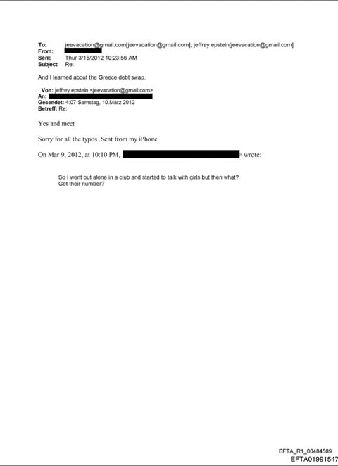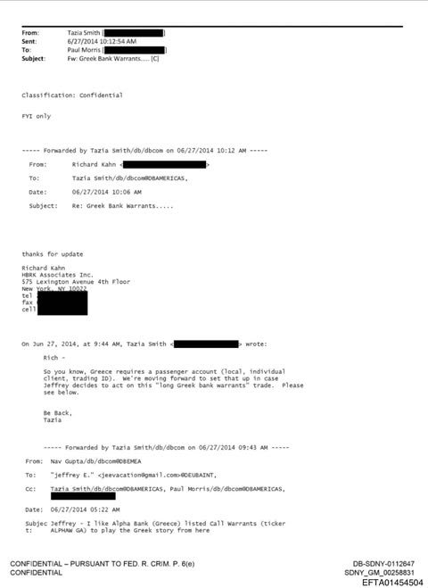 Παράλληλα, σε αλληλογραφία του Μαρτίου 2012, ο Έπσταϊν αναφέρεται στις ανταλλαγές ελληνικού χρέους, ενώ τον Ιούνιο του 2014 ενημερώνεται για τη δημιουργία τοπικών λογαριασμών με στόχο «long» θέσεις σε ελληνικά τραπεζικά warrants.