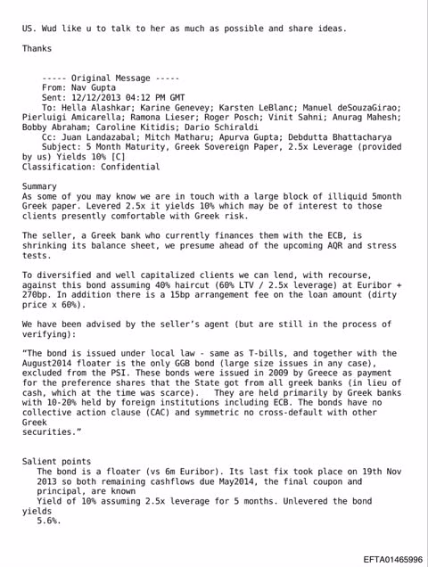 Σε άλλο έγγραφο, τον Δεκέμβριο του 2013, περιγράφεται επενδυτική ευκαιρία σε βραχυπρόθεσμα ελληνικά κρατικά ομόλογα πεντάμηνης διάρκειας, με έμφαση στη χαμηλή ρευστότητα αλλά και στις αποτιμήσεις.