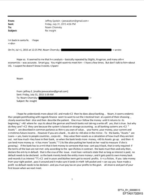 Ιδιαίτερη βαρύτητα έχουν τα emails μεταξύ του Τζέφρι Έπσταϊν και του Νόαμ Τσόμσκι, τον Ιούνιο και τον Ιούλιο του 2015. Σε αλληλογραφία της 29ης Ιουνίου 2015, ο Τσόμσκι αναφέρει ότι, σύμφωνα με οικονομολόγους που εξέτασαν τα στοιχεία, περίπου το 90% των πληρωμών προς την Ελλάδα στο πλαίσιο των διασώσεων κατέληγαν τελικά σε γερμανικές και γαλλικές τράπεζες, μέσω της εξυπηρέτησης παλαιότερων δανείων. Στο ίδιο μήνυμα χαρακτηρίζει τα χρέη αυτά «odious debts» (απεχθή χρέη) και εκτιμά ότι θα έπρεπε να αναδιαρθρωθούν ριζικά ή ακόμη και να ακυρωθούν.