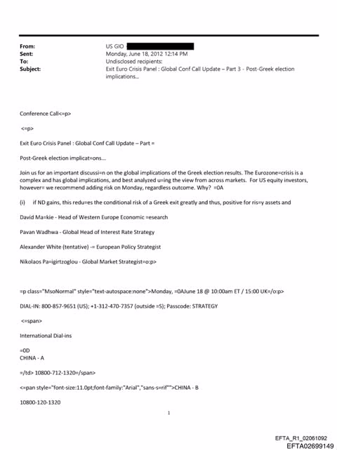 Στα έγγραφα περιλαμβάνεται και εσωτερικό υλικό του Γραφείου Παγκοσμίων Επενδύσεων των ΗΠΑ από τον Ιούνιο του 2012, το οποίο αφορά τηλεδιάσκεψη επενδυτών για τις επιπτώσεις των ελληνικών εκλογών εκείνης της περιόδου. Η Ελλάδα παρουσιάζεται ως παράγοντας διεθνούς συστημικού κινδύνου, με ανάλυση για το ενδεχόμενο εξόδου από την ευρωζώνη και τις πιθανές συνέπειες στις παγκόσμιες αγορές.