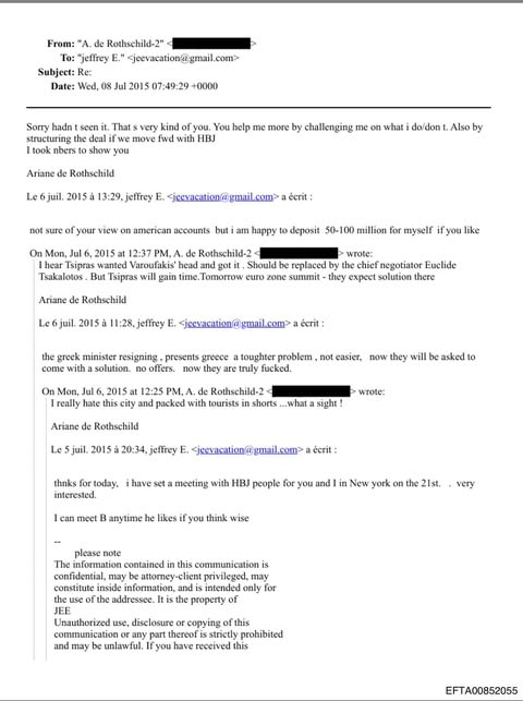 Η πολιτική κρίση του καλοκαιριού του 2015 αποτυπώνεται επίσης στα αρχεία. Σε email της 6ης Ιουλίου 2015, η επικεφαλής του Edmond de Rothschild Group, Αριάν ντε Ρότσιλντ, αναφέρει ότι «ακούγεται πως ο Αλέξης Τσίπρας ήθελε “το κεφάλι” του Βαρουφάκη και το πήρε», σημειώνοντας ότι πιθανός αντικαταστάτης του Γιάνη Βαρουφάκη θα ήταν ο Ευκλείδης Τσακαλώτος. Εκτιμά μάλιστα ότι η κίνηση αυτή θα έδινε χρόνο στον πρωθυπουργό ενόψει της κρίσιμης Συνόδου Κορυφής της Ευρωζώνης. Η απάντηση του Έπσταϊν είναι ωμή: Η παραίτηση του Έλληνα υπουργού, γράφει, δεν καθιστά το πρόβλημα ευκολότερο αλλά δυσκολότερο, καθώς πλέον «θα τους ζητηθεί να έρθουν με λύση, όχι με προτάσεις. Τώρα πραγματικά τη γά@#σαν».