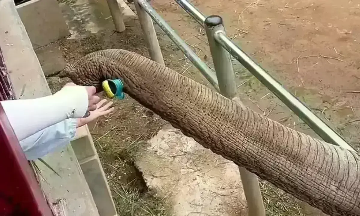 Στο χαριτωμένο κλιπ, το τεράστιο πλάσμα μπορεί να δει κανείς να μαζεύει απαλά το μικροσκοπικό μπλε και κίτρινο παπούτσι χρησιμοποιώντας το τεράστιο πόδι του και τον μακρύ κορμό του.