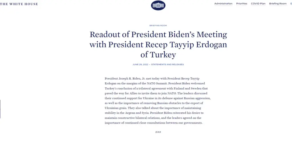 «Ο Πρόεδρος Τζόζεφ Ρ. Μπάιντεν, Τζούνιορ συναντήθηκε σήμερα με τον Πρόεδρο Ρετζέπ Ταγίπ Ερντογάν στο περιθώριο της Συνόδου Κορυφής του ΝΑΤΟ. Ο Πρόεδρος Μπάιντεν χαιρέτισε τη σύναψη τριμερούς συμφωνίας από την Τουρκία με τη Φινλανδία και τη Σουηδία που άνοιξε το δρόμο για τους Συμμάχους να τους καλέσουν να ενταχθούν στο ΝΑΤΟ.