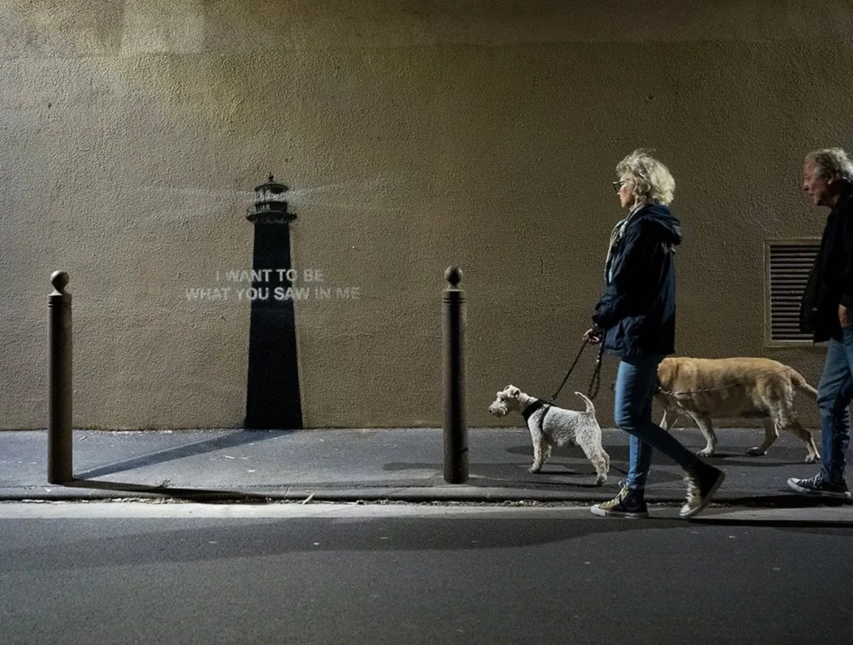 Φωτογραφίες που ανέβηκαν στον Instagram του μυστηριώδους καλλιτέχνη δείχνουν έναν φάρο να έχει σχεδιαστεί με στένσιλ σε έναν άχαρο, μπεζ τοίχο, μαζί με τα λόγια: «Θέλω να είμαι αυτό που είδες σε μένα.»