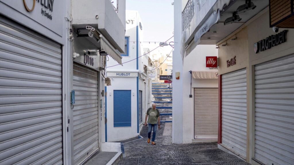 Στην κεντρική πόλη της Σαντορίνης, τη Φηρά, οι στενοί λευκοί δρόμοι ήταν έρημοι – μια σπάνια εικόνα, ακόμα και εκτός τουριστικής σεζόν – εκτός από μικρές ομάδες τουριστών.