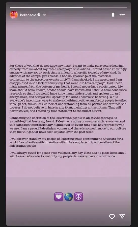 Στη συνέχεια, η Adidas ζήτησε συγγνώμη και είπε ότι θα «αναθεωρήσει» την καμπάνια της, επιβεβαιώνοντας στο Γαλλικό Πρακτορείο ότι η Hadid είχε αφαιρεθεί από αυτήν.