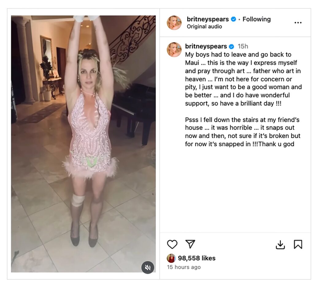 Στη λεζάντα της ανάρτησης, η 43χρονη Μπρίτνεϊ εξήγησε στους θαυμαστές της τι συνέβη, αναφέροντας επίσης ότι οι δύο γιοι της, Σον Πρέστον και Τζέιντεν Τζέιμς, είχαν φύγει για να επιστρέψουν στη Χαβάη.