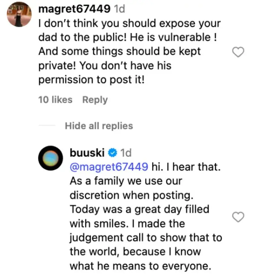 «Σε ακούω. Ως οικογένεια, χρησιμοποιούμε τη διακριτικότητά μας όταν δημοσιεύουμε. Σήμερα ήταν μια υπέροχη μέρα γεμάτη χαμόγελα. Πήρα την απόφαση να τη μοιραστώ με τον κόσμο, γιατί ξέρω πόσα σημαίνει ο πατέρας μου για όλους.»