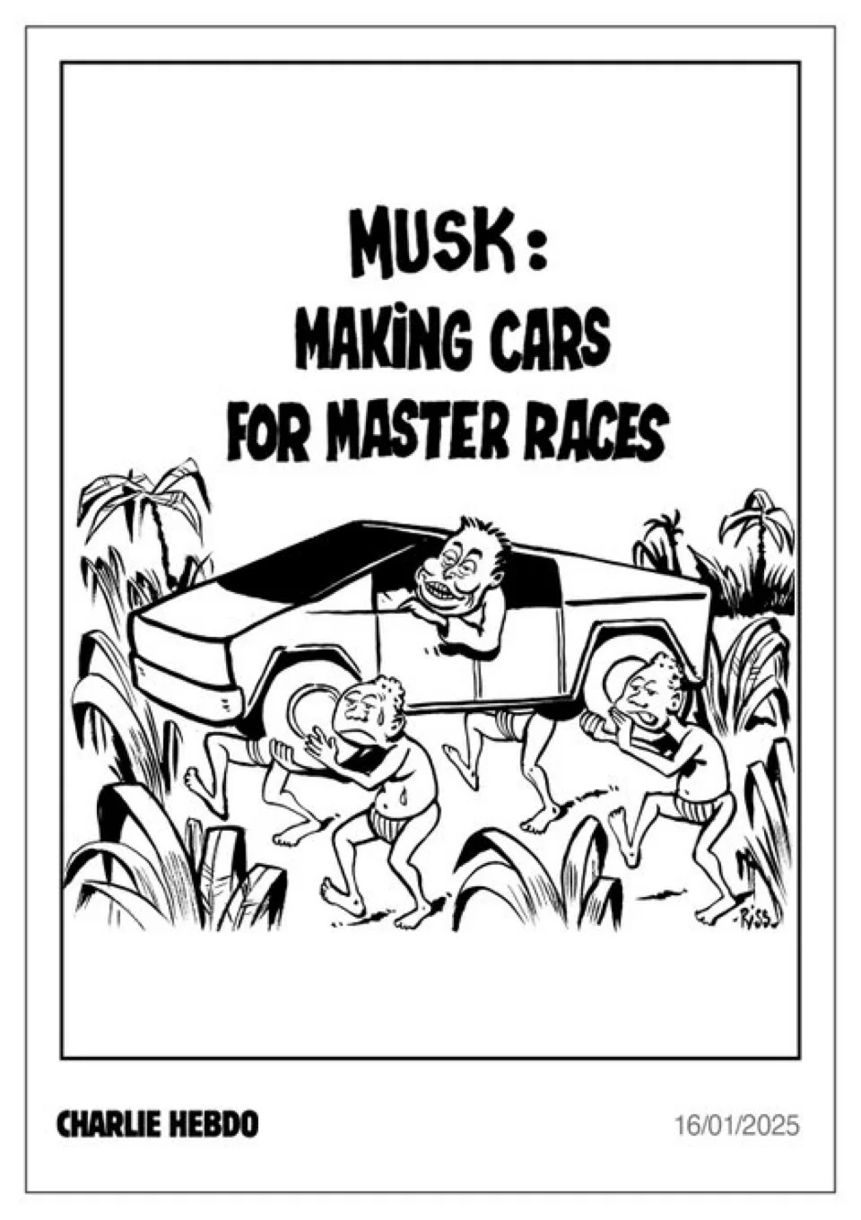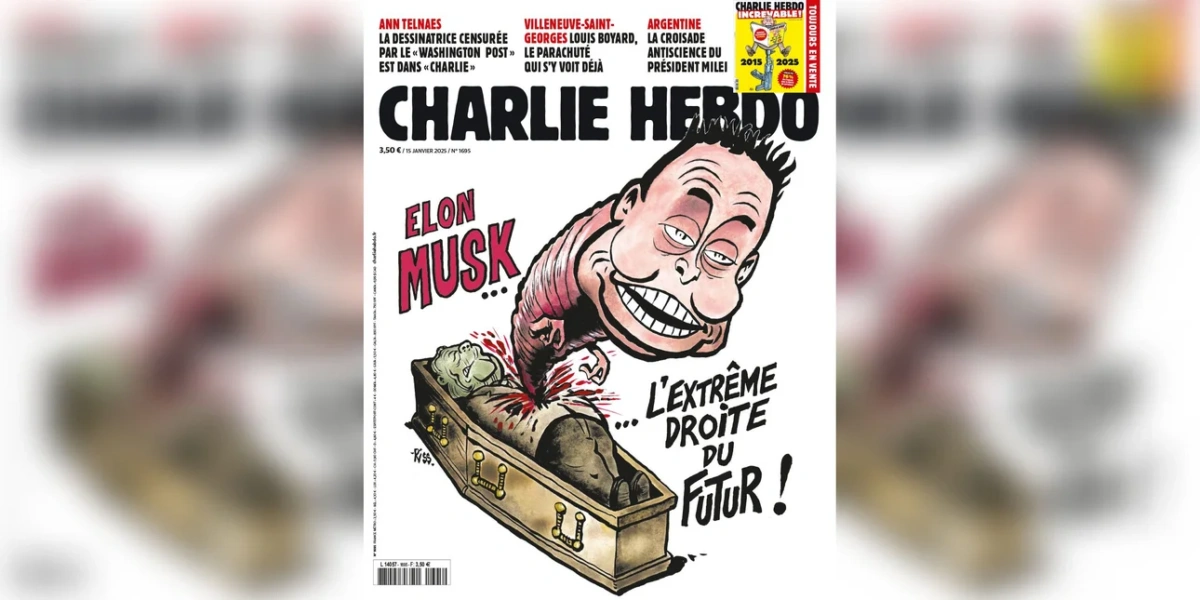 Το περιοδικό στο «αφιέρωμά» του για τον δισεκατομμυριούχο, περιλαμβάνει σκίτσα όπου στο ένα εμφανίζεται να βγαίνει ως… σκουλήκι από το φέρετρο του Ζαν Μαρί Λεπέν (με τη λεζάντα «η ακροδεξιά του μέλλοντος»), ενώ σε άλλο, να έχει μία βεντούζα με την οποία… ξεβουλώνει τα οπίσθια του Τραμπ, με τη λεζάντα: ο Μασκ ξεμπλοκάρει την ελευθερία του λόγου…