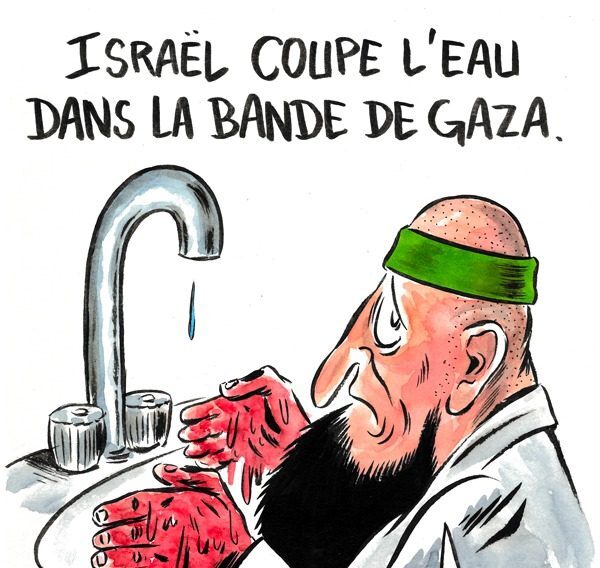 Τώρα, το Charlie Hebdo βρίσκεται στην πρώτη γραμμή κατά της τρομοκρατικής οργάνωσης Χαμάς και στο τελευταίο σκίτσο αποτυπώνεται η πραγματικότητα των μεθόδων της. Κάτω από την είδηση «Το Ισραήλ κόβει το νερό στη Λωρίδα της Γάζας», ένας εκπρόσωπος της Χαμάς δεν βρίσκει νερό στη βρύση για να πλύνει τα αιματοβαμμένα χέρια του από το μακελειό που διέπραξε η οργάνωση στο Ισραήλ. Μάλιστα, αναρωτιέται, υποκριτικά, για το κόψιμο του νερού: «Μα ως πού θα φτάσει αυτή η βαρβαρότητα;»