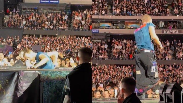 The moment Chris Martin fell through a trapdoor right in front of me at the #Coldplay concert tonight. pic.twitter.com/qIdzMEGG0s