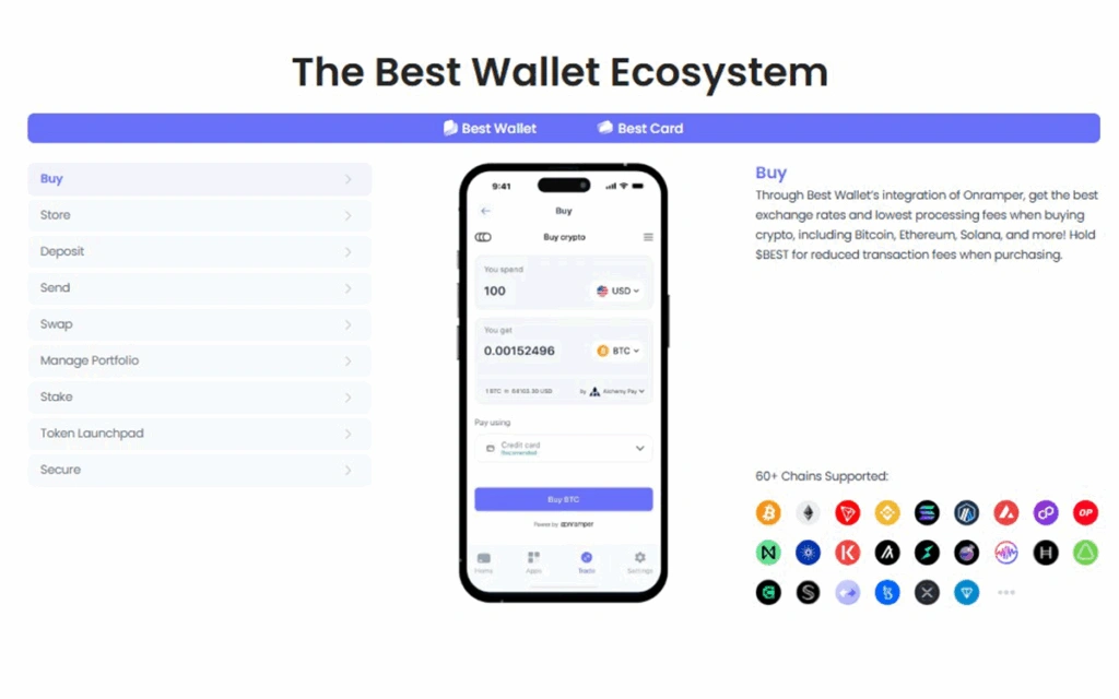 Πρόκειται για ένα σύγχρονο crypto wallet, που επιτρέπει αγορά, ανταλλαγή και staking κρυπτονομισμάτων, απευθείας μέσα από την εφαρμογή του για κινητά Android και iOS, χωρίς περίπλοκες διαδικασίες. Μάλιστα, το πορτοφόλι έχει ξεκινήσει τη διάθεση του δικού του κρυπτονομίσματος μέσω προπώλησης και συγκεκριμένα του $BEST. Ένα token που ξεκλειδώνει πρόσθετα οφέλη στους κατόχους του, με βασικότερα τα παρακάτω: