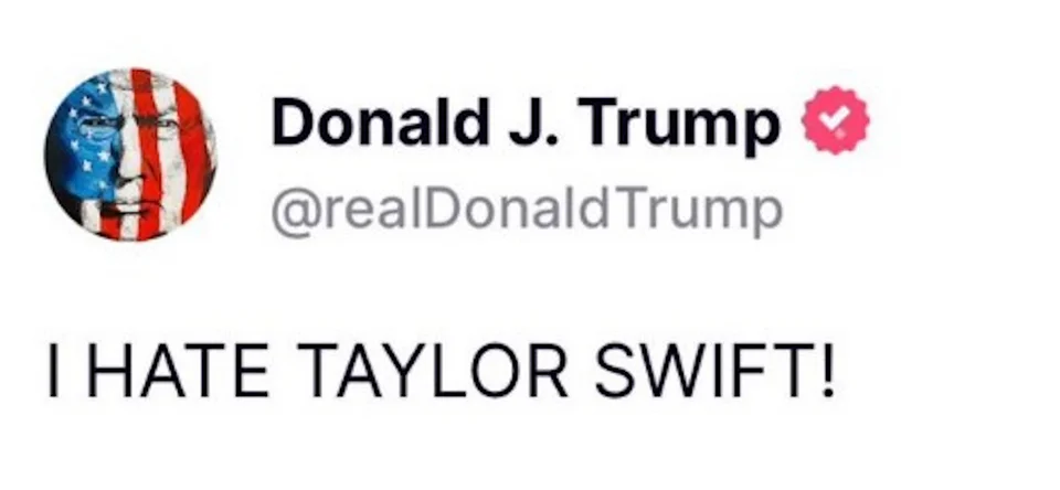 «ΜΙΣΩ ΤΗΝ ΤΕΙΛΟΡ ΣΟΥΙΦΤ!», έγραψε ο Τραμπ στο μέσο κοινωνικής δικτύωσης, Truth Social με κεφαλαία γράμματα. Η ανάρτηση έρχεται λίγο μετά την ανοιχτή στήριξη της Σουίφτ στην υποψήφια για την προεδρία εκ μέρους των Δημοκρατικών, Κάμαλα Χάρι. Παλιότερα είχε υποστηρίξει ανοιχτά και τον νυν πρόεδρο., Τζο Μπάιντεν στις εκλογές του 2020.