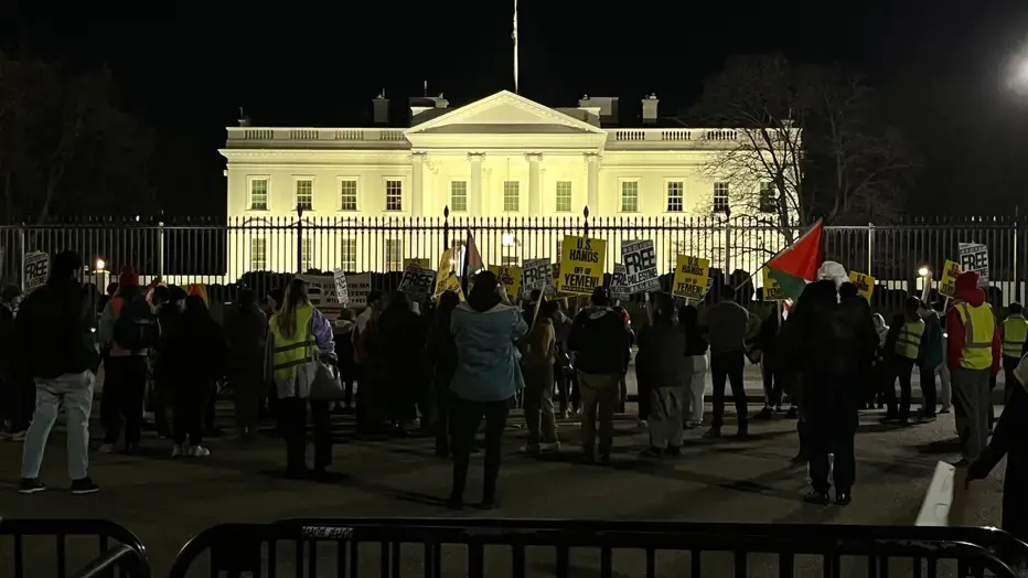 Οι διαδηλωτές κοντά στον Λευκό Οίκο ανέμιζαν σημαίες της Παλαιστίνης και κράταγαν πανό και πλακάτ με συνθήματα όπως «Λευτεριά στην Παλαιστίνη» ή «σταματήστε να βομβαρδίζετε την Υεμένη».