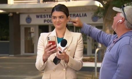 Καθώς ετοιμαζόταν για ένα ζωντανό ρεπορτάζ, ένα τούφας από τα μαλλιά της είχε… επαναστατήσει. Ο εικονολήπτης της, βλέποντας την κατάσταση, εμφανίστηκε ξαφνικά μπροστά της και αποφάσισε να παρέμβει — με έναν ιδιαίτερο τρόπο: έγλειψε το δάχτυλό του και της “ίσιωσε” την τρίχα.