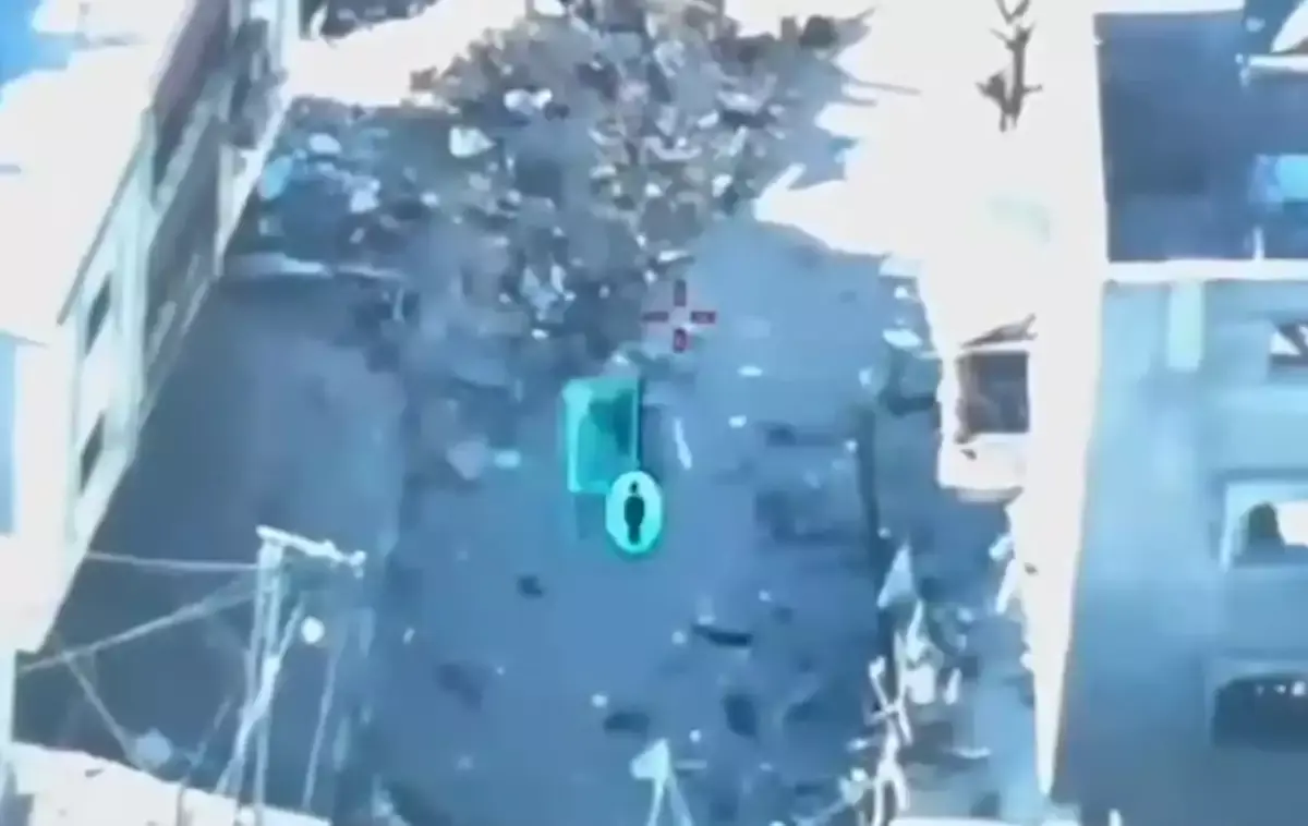 To drone καταγράφει με ακρίβεια τις κινήσεις του άνδρα, που προσπαθεί να κρυφτεί ανάμεσα στα κτίρια, ενώ λίγο αργότερα φαίνεται μια έκρηξη.