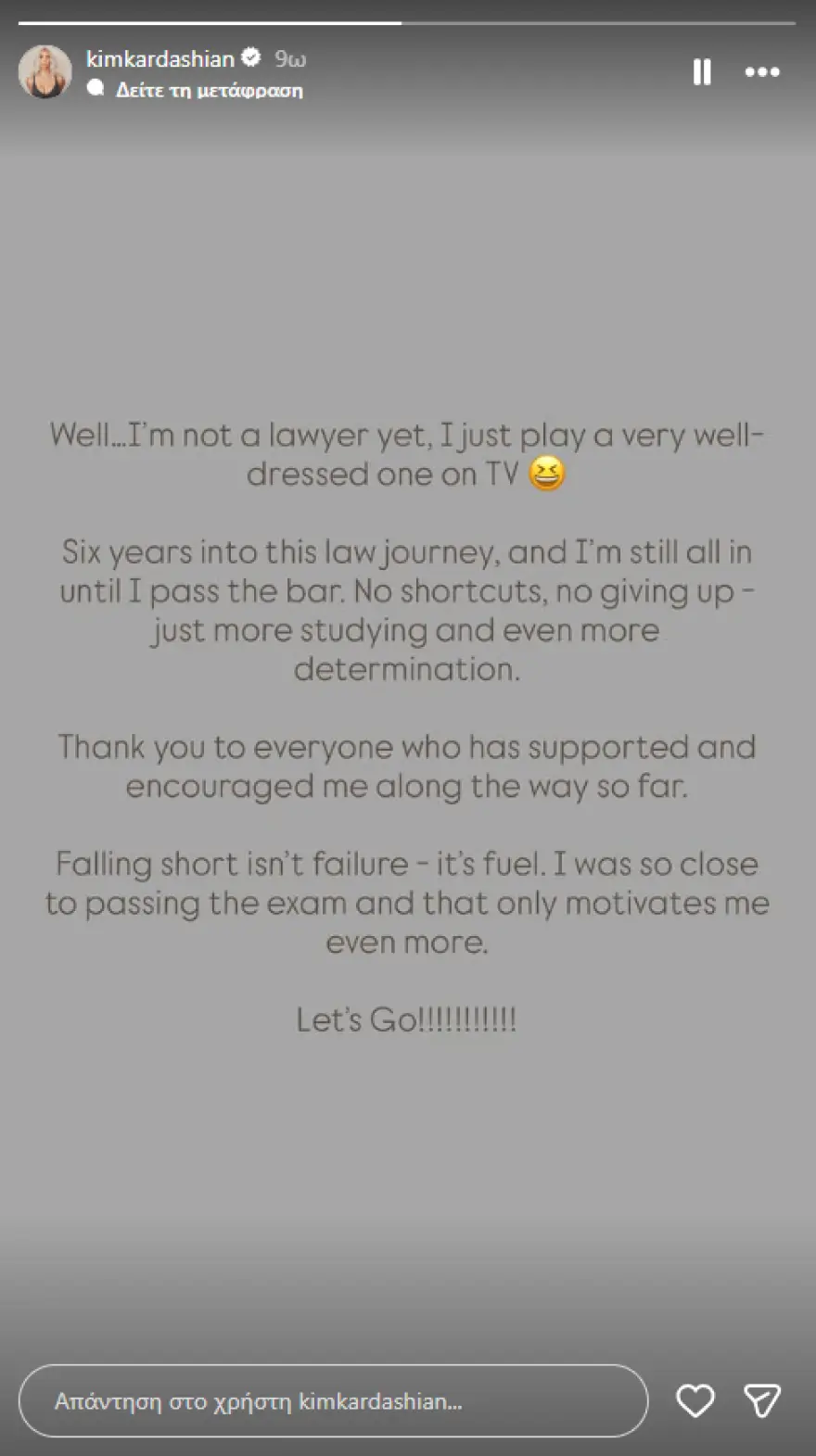 Ευχαρίστησε «όλους όσοι την υποστήριξαν και την ενθάρρυναν» και έγραψε πως «Το να πέσεις είναι ενέργεια και όχι αποτυχία. Ήμουν τόσο κοντά στο να περάσω τις εξετάσεις και αυτό με κινητοποιεί ακόμα περισσότερο. Πάμε δυνατά!!!». Η απόφασή της να σπουδάσει Νομική ανακοινώθηκε το 2019 σε συνέντευξη στο περιοδικό Vogue και, όπως έχει πει, την ενέπνευσε η υπόθεση της Άλις Μαρί Τζόνσον που οδήγησε στην απελευθέρωσή της το 2018.