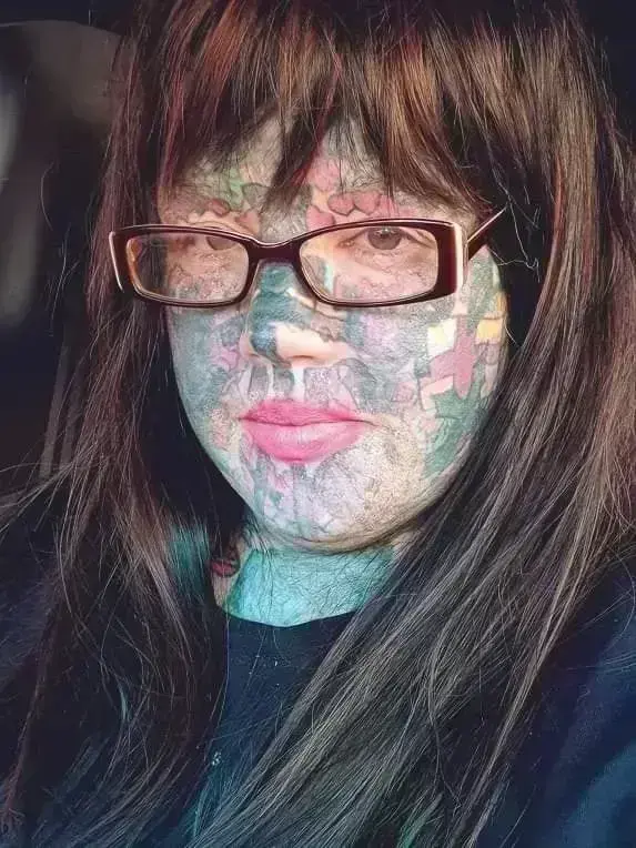 Η Melissa Sloan από την Ουαλία έχει περισσότερα από 800 τατουάζ, συμπεριλαμβανομένων τετράγωνων με έντονα χρώματα και καρδιές σε όλο το πρόσωπό της, κυρίως από τον σύντροφό της Luke.