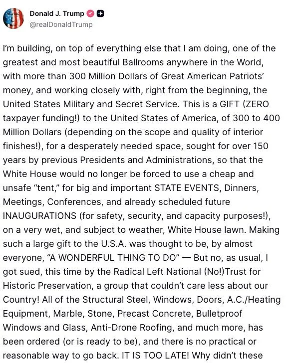 «Χτίζω, επιπλέον όλων των άλλων που κάνω, μία από τις μεγαλύτερες και ωραιότερες αίθουσες χορού του κόσμου», έγραψε σήμερα στο Truth Social ο Τραμπ. «ΕΙΝΑΙ ΠΟΛΥ ΑΡΓΑ» για να σταματήσουν οι εργασίες αυτού του «ΔΩΡΟΥ για τις Ηνωμένες Πολιτείες».