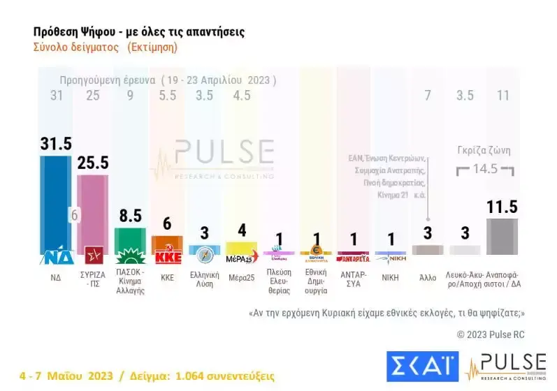 Το κυβερνών κόμμα, 10 ημέρες πριν το άνοιγμα της κάλπης, δείχνει να παγιώνει τη διαφορά του σε ένα ποσοστό άνω του 6%, καλύπτοντας ένα σημαντικό μέρος των απωλειών που είχε μετά την τραγωδία στα Τέμπη. Τόσο η Νέα Δημοκρατία, όσο και ο ΣΥΡΙΖΑ έχουν «τσιμμπήσει» μισή μονάδα προς τα πάνω στα ποσοστά τους, πιέζοντας ολοένα και περισσότερο τα ποσοστά των μικρότερων κομμάτων. Η έρευνα πραγματοποιήθηκε στο διάστημα από τις 4 έως τις 7 Μαΐου και αποτυπώνει το κλίμα λίγο πριν το σημαντικό debate των αρχηγών που θα διεξαχθεί αύριο στις 21:00.