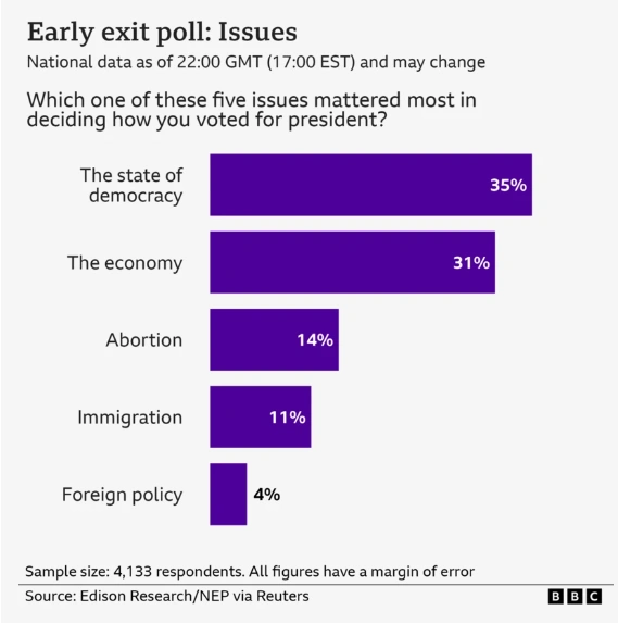 Η οικονομία έχει προηγουμένως βρεθεί στην κορυφή του καταλόγου των θεμάτων που κινητοποιούν τους ψηφοφόρους και κατατάσσεται πρώτη στο exit poll για κάθε προεδρική εκλογή από το 2008. Παραμένει εντός του περιθωρίου σφάλματος. Αυτά είναι πρώιμα ποσοστά και είναι πιθανό να αλλάξουν καθώς θα έρχονται περισσότερα κύματα δεδομένων exit poll κατά τη διάρκεια της βραδιάς από τους ψηφοφόρους σε όλη τη χώρα.