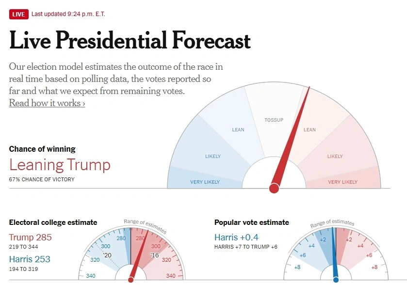 Η πιθανότητα νίκης του Ντόναλντ Τραμπ υπολογίζεται στο 67%.