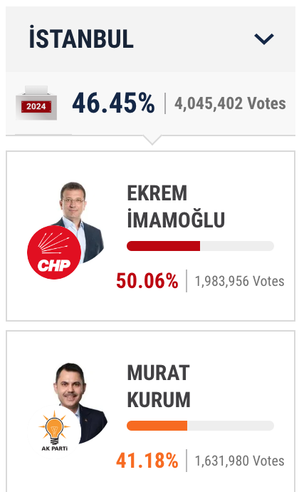 Με καταμετρημενο το 46,65% των ψήφων, Ιμάμογλου παίρνει 50,6% με το 37,39%, ενώ ο Μουράτ Κουρούμ, ο υποψήφιος από το Κόμμα AKP του Προέδρου Ταγίπ Ερντογάν, λαμβάνει το 41,18%.