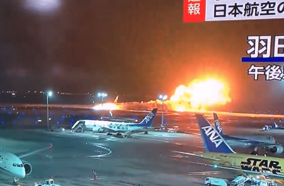 Βίντεο από τοπικό τηλεοπτικό σταθμό δείχνει μια μεγάλη έκρηξη πυρκαγιάς που ξέσπασε από την πλευρά ενός αεροπλάνου της Japan Airlines καθώς αυτό τροχοδρομούσε σε διάδρομο προσγείωσης. Στη συνέχεια, η περιοχή γύρω από την πτέρυγα του αεροσκάφους πήρε γρήγορα φωτιά.