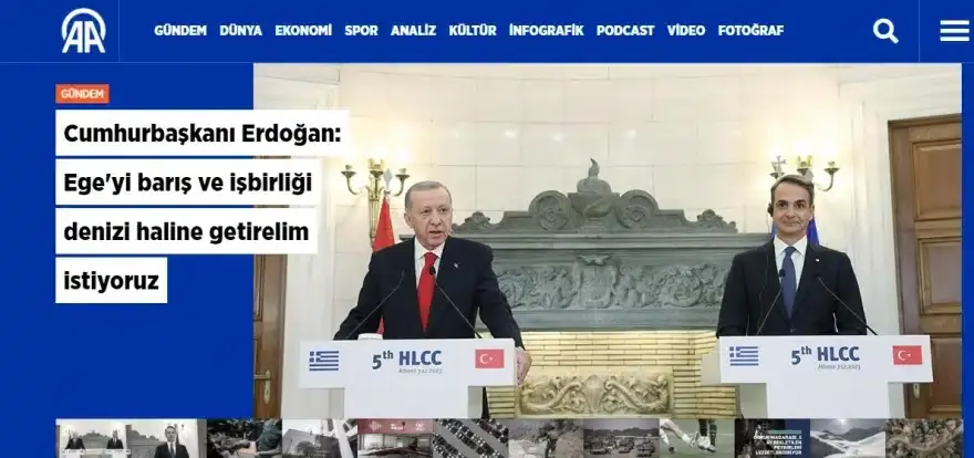 Το πρακτορείο Anadolu παρουσιάζει την επίσκεψη του Ερντογάν στην Αθήνα με κεντρικό τίτλο «Θέλουμε να μετατρέψουμε το Αιγαίο σε θάλασσα ειρήνης και συνεργασίας», ενώ φιλοξενεί τις δηλώσεις που έκανε μετά το τέλος της συνάντησης με τον Κυριάκο Μητσοτάκη. «Επιθυμούμε να λύσουμε τα τρέχοντα προβλήματά μας μέσω εποικοδομητικού διαλόγου, καλής γειτονίας και κοινών προσπαθειών στο πλαίσιο του διεθνούς δικαίου.