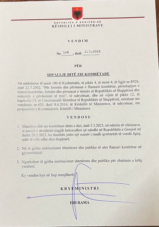 «Η τραγωδία της Ελλάδας είναι και δική μας τραγωδία, ο πόνος για τις ζωές που χάθηκαν στο τρομερό δυστύχημα είναι και δικός μας. Αυτή είναι μια από εκείνες τις στιγμές της ζωής, όπου μια μεγάλη απώλεια για τον γείτονα δείχνει ότι οι ζωές μας είναι άρρηκτα συνδεδεμένες και ότι πρέπει να κάνουμε ό,τι καλύτερο μπορούμε για να τις κάνουμε καλύτερες, συνεργαζόμενοι όλο και περισσότερο μεταξύ μας. Την Κυριακή (5/2), η Αλβανία θα τιμήσει συμβολικά τα θύματα της τραγωδίας με ημέρα πένθους, έχοντας την εθνική σημαία μεσίστια».